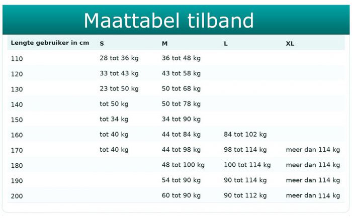 Tilband: Bij de passieve tillift hoort ook een tilband. Deze kiest u zelf uit aan de hand van de maattabel. U kijkt eerst naar uw lengte en vervolgens naar uw gewicht. Voorbeeld: U bent 160 cm lang en 70 kg. Dan heeft u de tilband maat Medium nodig.