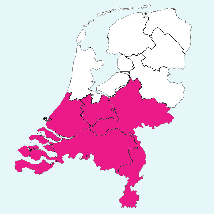 Op dit moment bieden wij thuisadvies aan in een groot deel van Nederland. Dit zijn de provincies die op de kaart in het roze zijn weergegeven. In deze regio’s hebben wij voldoende adviseurs om u persoonlijk thuis te kunnen helpen. Helaas is het voor ons op dit moment nog niet mogelijk om in Noord-Nederland thuisadvies aan te bieden. Woont u in een gebied waar wij (nog) niet aan huis komen, dan kunnen we u op andere manieren helpen: